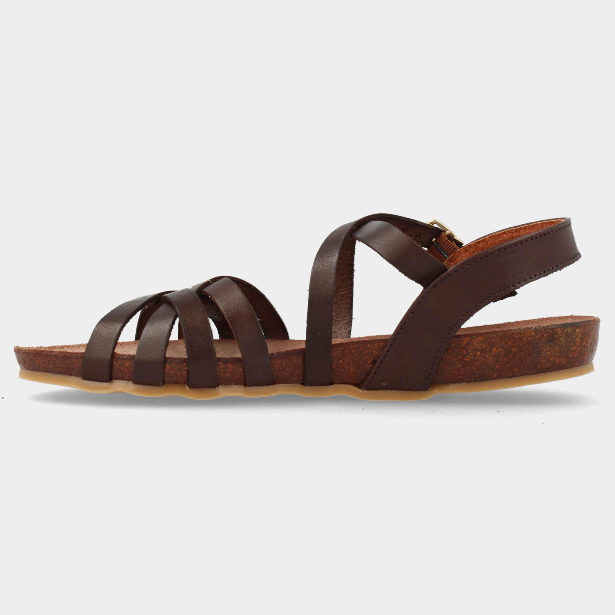 Op zoek naar simpel maar hip voor deze zomer? Deze bruine sandaal heeft het. Dit model is gemaakt van soepel leer in combinatie met een comfy zool van kurk met een leren voetbed. Dit model staat bekend om zijn fijne draagcomfort! Je sluit de sandaal door de kleine gesp. De bandjes draperen over je hele voet. Kortom; een perfect model die overal bij past en je overal naartoe aan kunt.